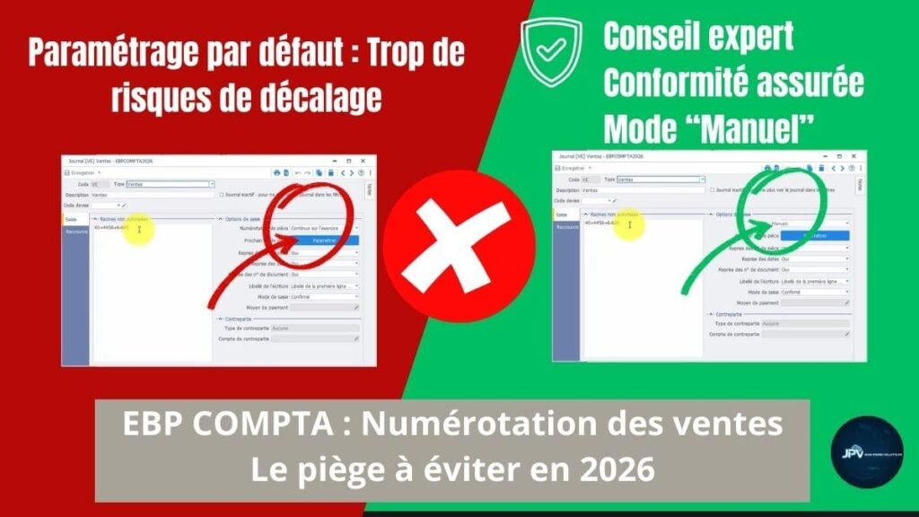 La réalité du terrain : En comptabilité, ce qui fait foi, c’est la pièce justificative. Si vous saisissez manuellement vos factures depuis un logiciel externe ou un facturier papier, le compteur d’EBP va inévitablement se décaler. Une erreur de saisie, un avoir oublié, ou une suppression d’écriture, et voilà que votre facture $n°FAC-2026-042$ se retrouve enregistrée sous le numéro de pièce $n°39$ en comptabilité.